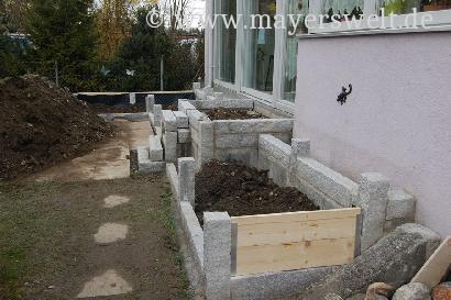 Bild 10 von 19Tag 8,5: U-Profile sind zugeschnitten und Holzwände incl. Noppenbahn sind an Ort und Stelle. So konnten nun die ersten Erdhaufen zurück ins Beet geschaufelt werden. << Vollbild >>