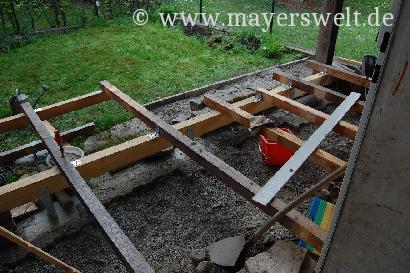 Bild 6 von 19Nachdem vorm Haus alles so schön ist, habe ich aus den Resten diverser Holzregale die Unterkonstruktion für die Veranda gebaut. << Vollbild >>